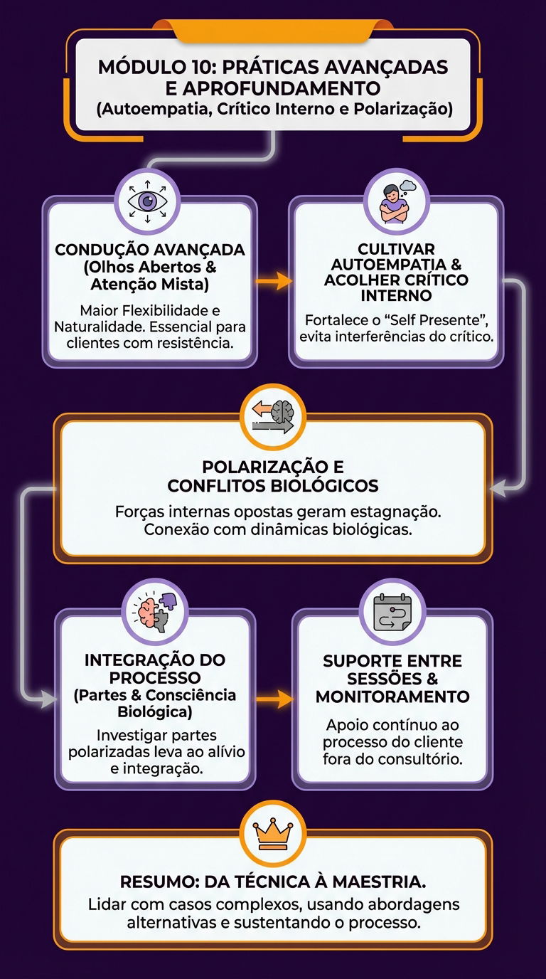 👉 **Em resumo:** este módulo ensina o terapeuta a lidar com casos mais complexos, utilizando conduções alternativas (como olhos abertos), cultivando autoempatia, reconhecendo o crítico interno, trabalhando polarizações e sustentando o processo entre as sessões. É o passo para transformar técnica em maestria.
