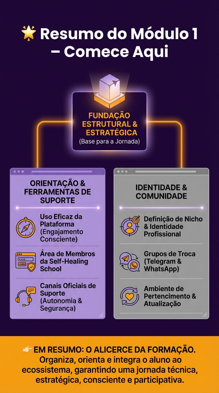 👉 Em resumo: este módulo estabelece o terreno. Ele organiza, direciona e integra o aluno ao ecossistema da formação, garantindo que a jornada não seja apenas técnica, mas também estratégica, consciente e participativa.