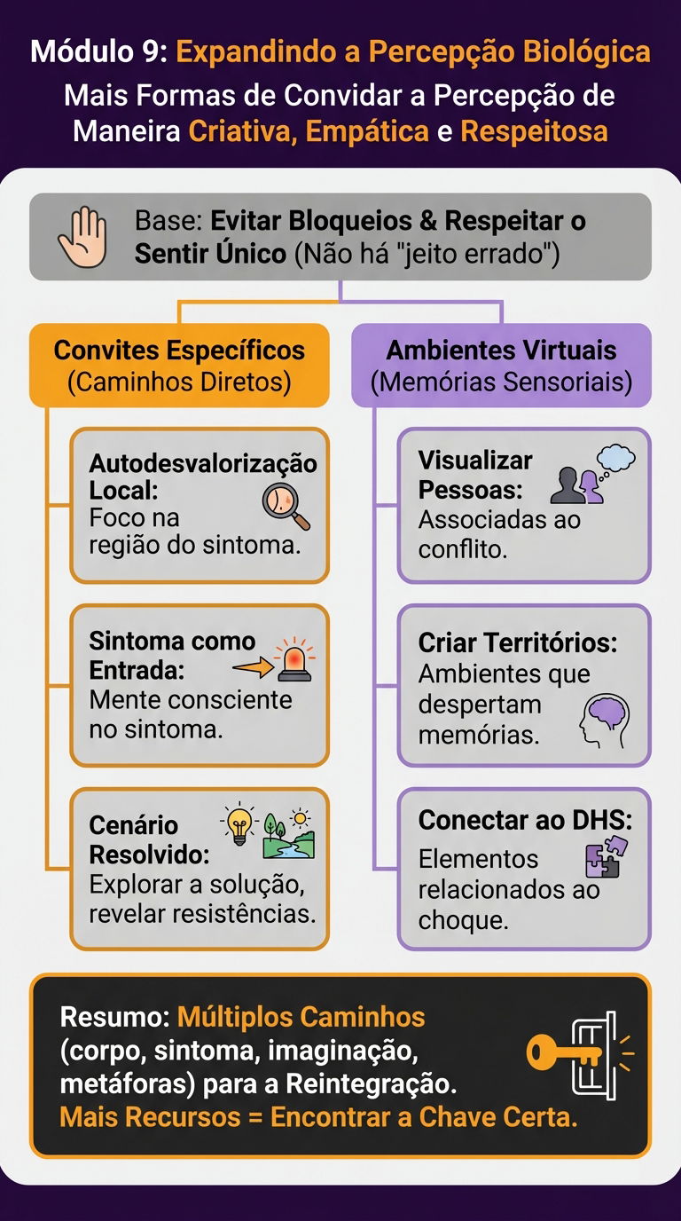 👉 Em resumo: este módulo amplia a caixa de ferramentas do terapeuta, mostrando que o convite para a Percepção Biológica pode ser feito por múltiplas vias — seja pelo corpo, pelo sintoma, pelo imaginário ou pelas metáforas. Quanto mais recursos o terapeuta domina, mais capaz se torna de encontrar a chave certa para abrir o caminho da reintegração.