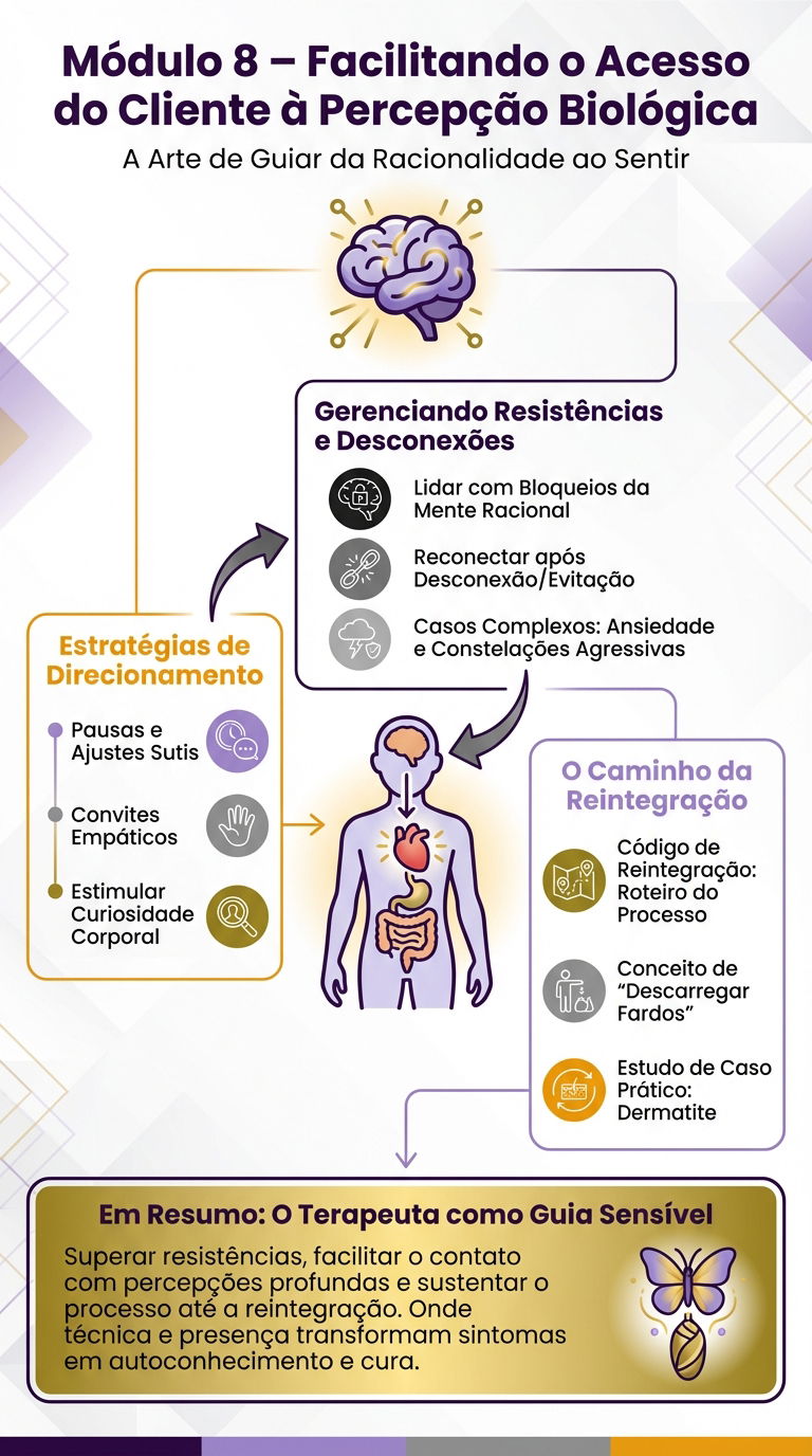 Este módulo aprofunda a arte de conduzir o cliente até a Percepção Biológica, especialmente nos momentos em que a mente racional ou as defesas internas tentam bloquear o processo.