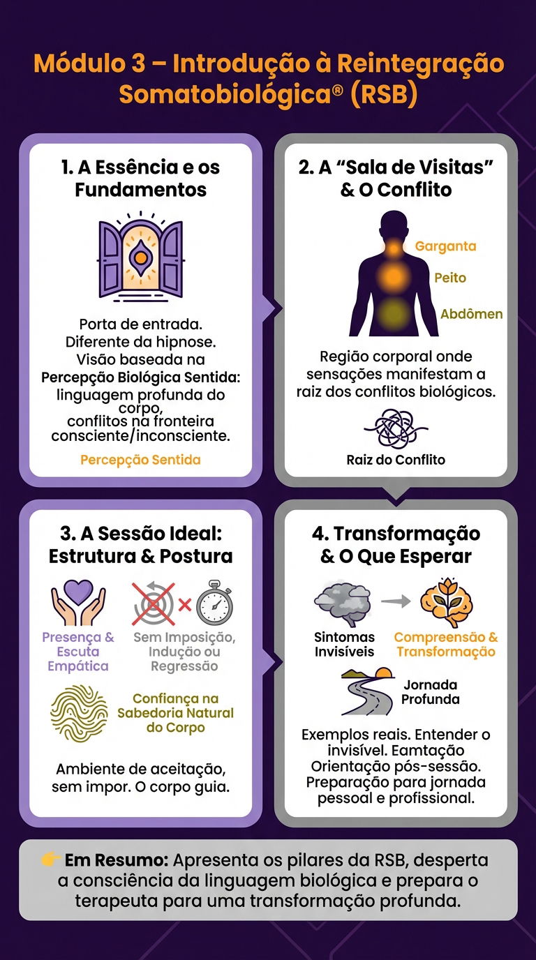 👉 Em resumo: este módulo ensina que o convite não é uma técnica mecânica, mas uma arte de presença e escuta. É a chave que abre o salão de contato e conduz o cliente à reconciliação com suas partes internas, tornando o processo de Reintegração Somato Biológica® profundo, eficaz e humano.