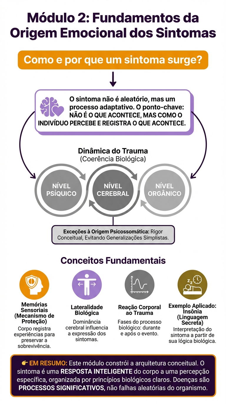 👉 Em resumo: este módulo constrói a arquitetura conceitual da psicossomática aplicada. Ele mostra que o sintoma é uma resposta inteligente do corpo a uma percepção específica, organizada por princípios biológicos claros, e prepara o aluno para enxergar enfermidades como processos com sentido, e não como falhas aleatórias do organismo.