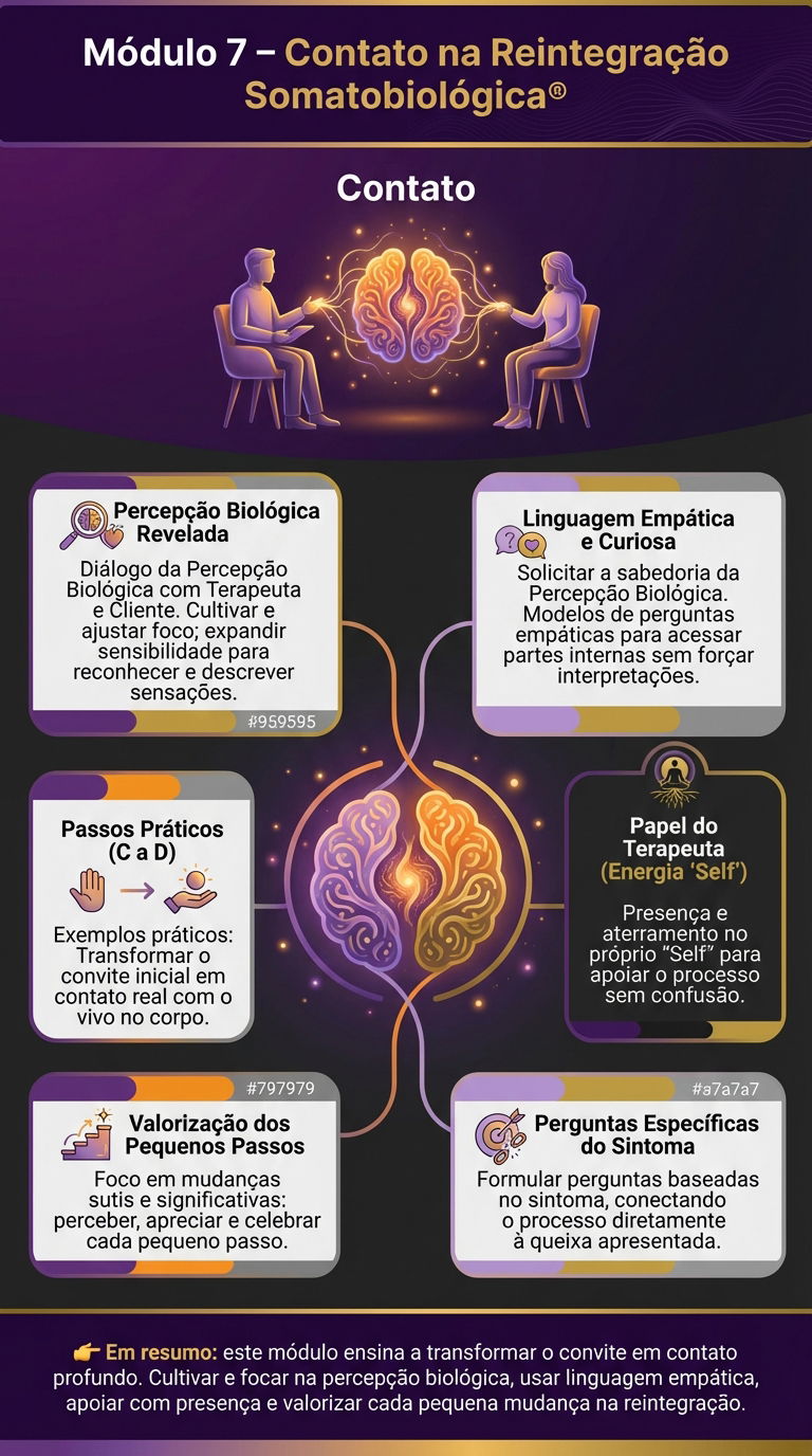 👉 Em resumo: este módulo ensina o terapeuta a transformar o convite em um contato profundo. Mostra como cultivar, focar e descrever a percepção biológica, usar a linguagem empática, sustentar o processo com presença e valorizar cada pequena mudança como um passo essencial na reintegração.