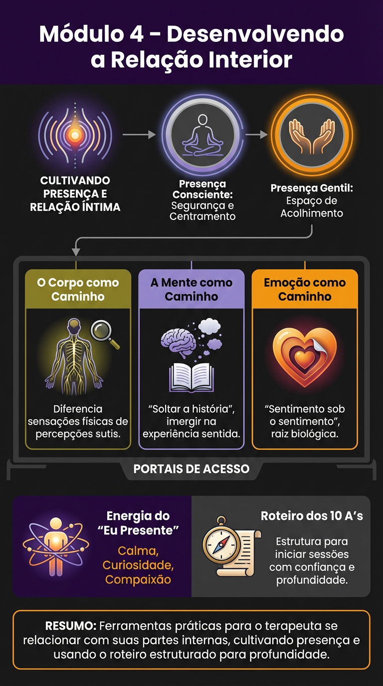 Outro ponto central é o desenvolvimento da Energia do “Eu Presente”, estado de consciência que sustenta o processo terapêutico com calma, curiosidade e compaixão. Para consolidar a prática, o módulo apresenta os 10 A’s, um roteiro estruturado que guia desde a abertura do espaço interno até a apreciação das mudanças trazidas pela sessão.