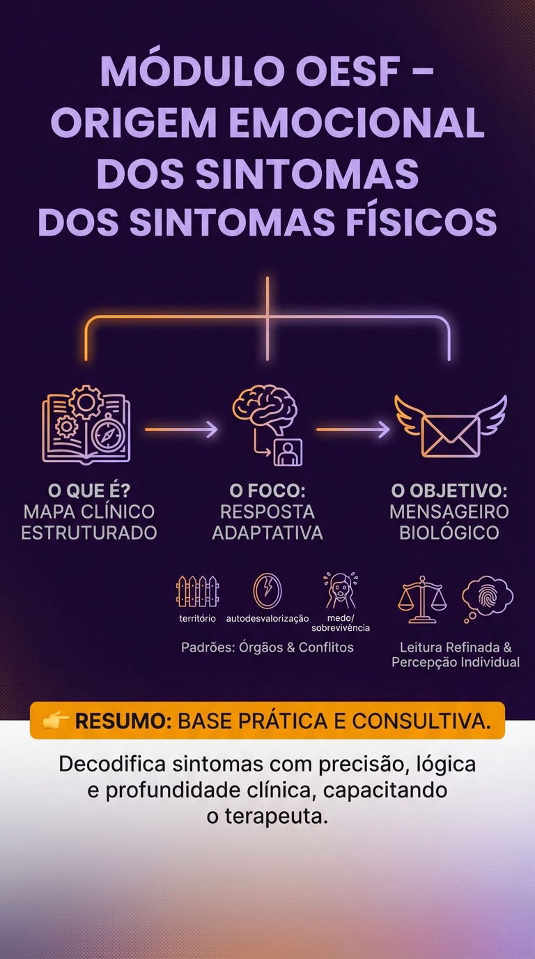 👉 **Em resumo:** este módulo organiza o conhecimento psicossomático em formato consultivo. Ele oferece uma base prática para decodificar sintomas físicos a partir de sua origem emocional, transformando o terapeuta em um profissional capaz de interpretar o corpo com precisão, lógica e profundidade clínica.
