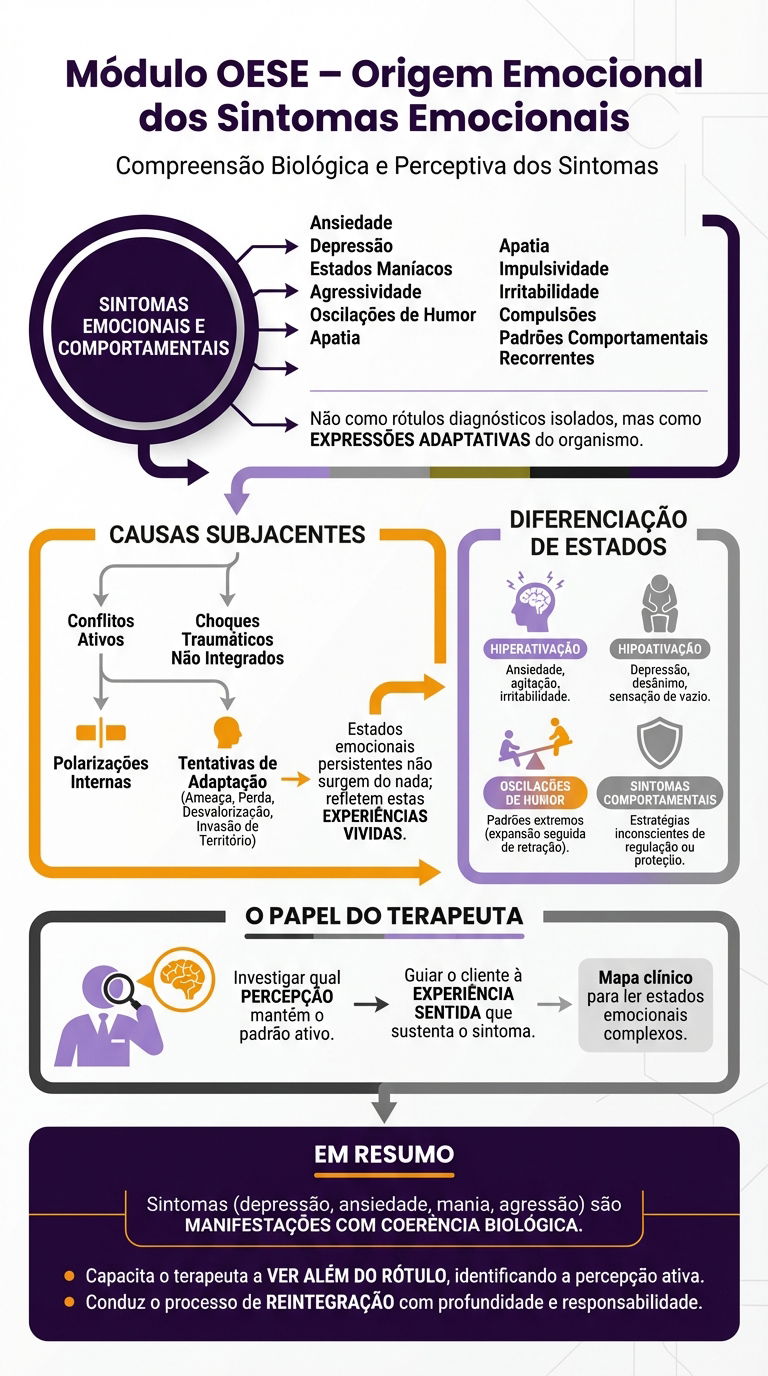 Este módulo aprofunda a compreensão dos **sintomas emocionais e comportamentais** a partir de uma lógica biológica e perceptiva. Ele organiza quadros como **ansiedade, depressão, estados maníacos, agressividade, oscilações de humor, apatia, impulsividade, irritabilidade, compulsões e padrões comportamentais recorrentes**, analisando-os não como rótulos diagnósticos isolados, mas como expressões adaptativas do organismo.